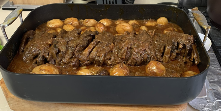 רצוי להוציא את הבשר לטמפרטורת החדר לפחות שעה לפני הבישול. 1. מתחילים בתיבול גוש הבשר. בקערה שטוחה או צלחת מלבנית שמים כף גדושה שמן,את הפפריקה,הכמון,פלפל גרוס,אבקת מרק השום והמלח ומערבבים לתערובת אחידה. מורחים את התערובת על נתח הבשר מכל צדדיו. 2. בסיר גדול שטוח מחממים 3 כפות שמן 3. כשהשמן חם מכניסים את העגבניות והבצל ומטגנים עד להזהבה 4. מכניסים את נתח הבשר וצולים אותו היטב מכל הצדדים. 5. שופכים על הבשר את היין ומוסיפים כוס מים רותחים. 6. מבשלים באש בינונית נמוכה כשעה מידי פעם יש להפוך את הבשר. 7. מוציאים את הבשר ועוטפים אותו קודם בנייר אפיה ואחרי זה בנייר כסף וישר למקרר ללילה. 8. שומרים את הרוטב בסיר במקרר. 9. למחרת מחממים את הרוטב, פורסים את הבשר לפרוסות לא עבות ומכניסים לסיר להמשך בישול עד שהבשר רך והרוטב הצטמצם.