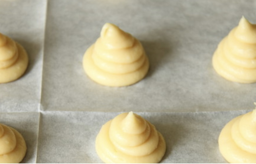 מזלפים עיגולים על נייר אפיה במרווח אחד מהשני. התלולית צריכה להיות גבוהה. לא שטוחה לחלוטין ובלי שפיץ למעלה אחרת הוא ישרף באפיה. ( ליישר אותו עם אצבע לחה).